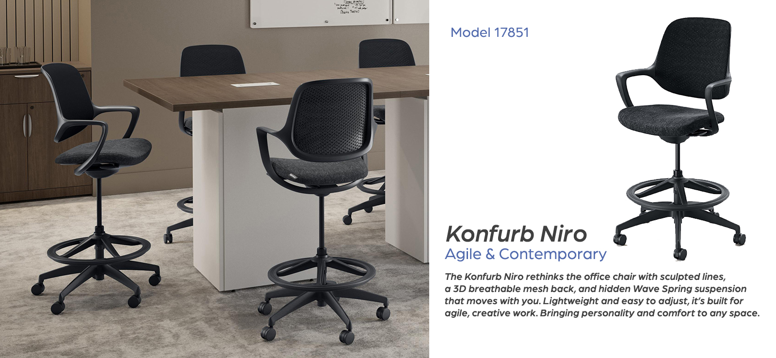 The Konfurb Niro rethinks the office chair with sculpted lines, a 3D breathable mesh back, and hidden Wave Spring suspension that moves with you. Lightweight and easy to adjust, it’s built for agile, creative work. Bringing personality and comfort to any space.